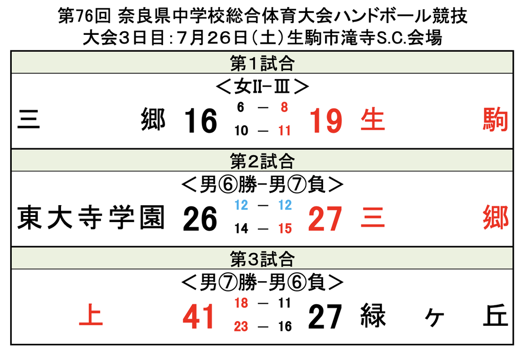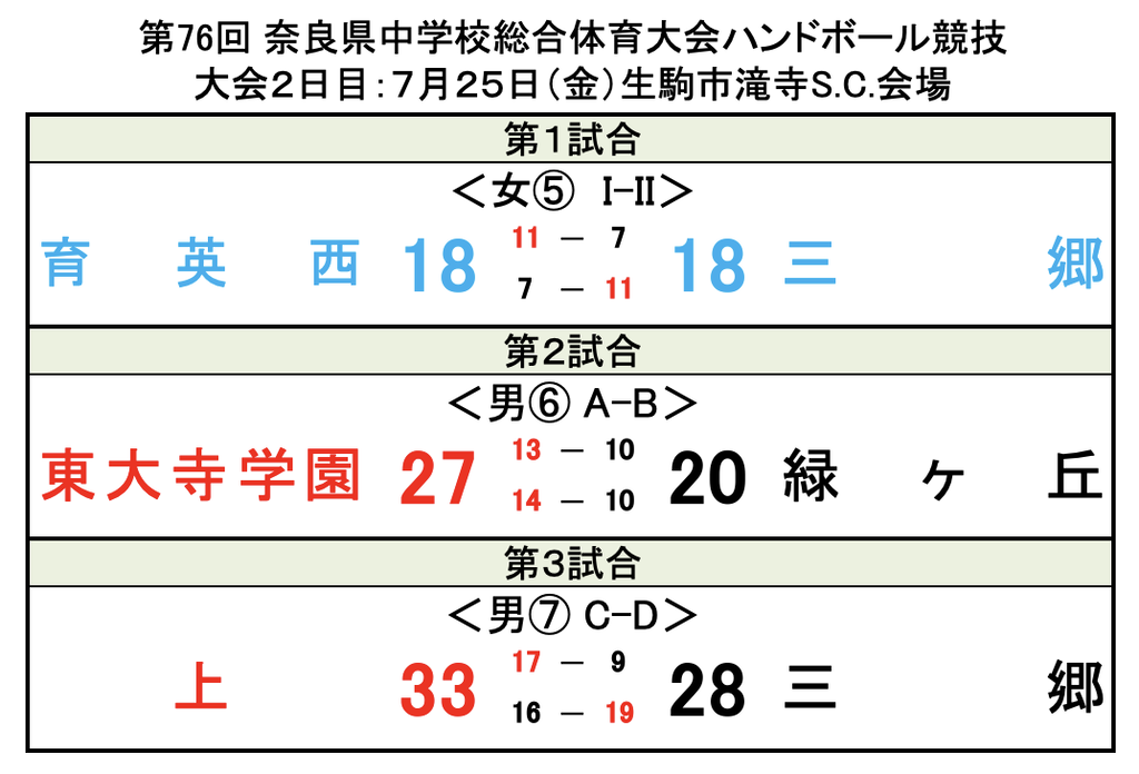 第76回 奈良県中学校総合体育大会ハンドボール競技 1日目結果