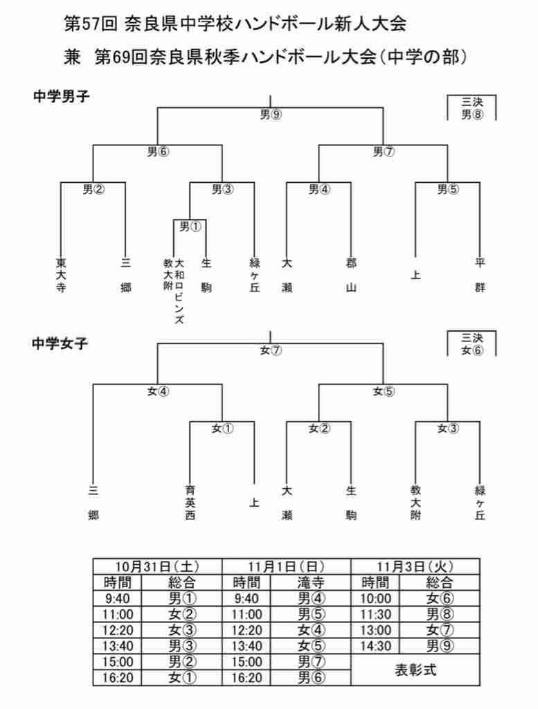 第57回奈良県中学校ハンドボール新人大会兼第69回奈良県秋季ハンドボール大会(中学の部)組み合わせ