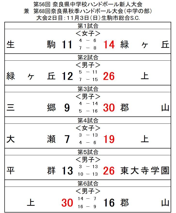 2019年11月03日 第56回奈良県中学校ハンドボール新人大会2日目結果(11月3日) 予選の結果、上記の学校で男子リーグ戦・女子リーグ戦を行います。最後まで応援よろしくお願いいたします。※表記にミスがありましたので、訂正させていただきました。(11月4日)