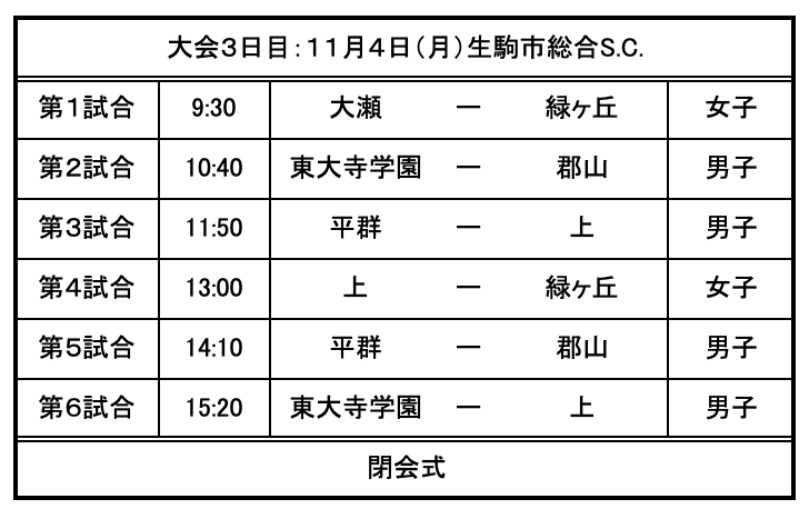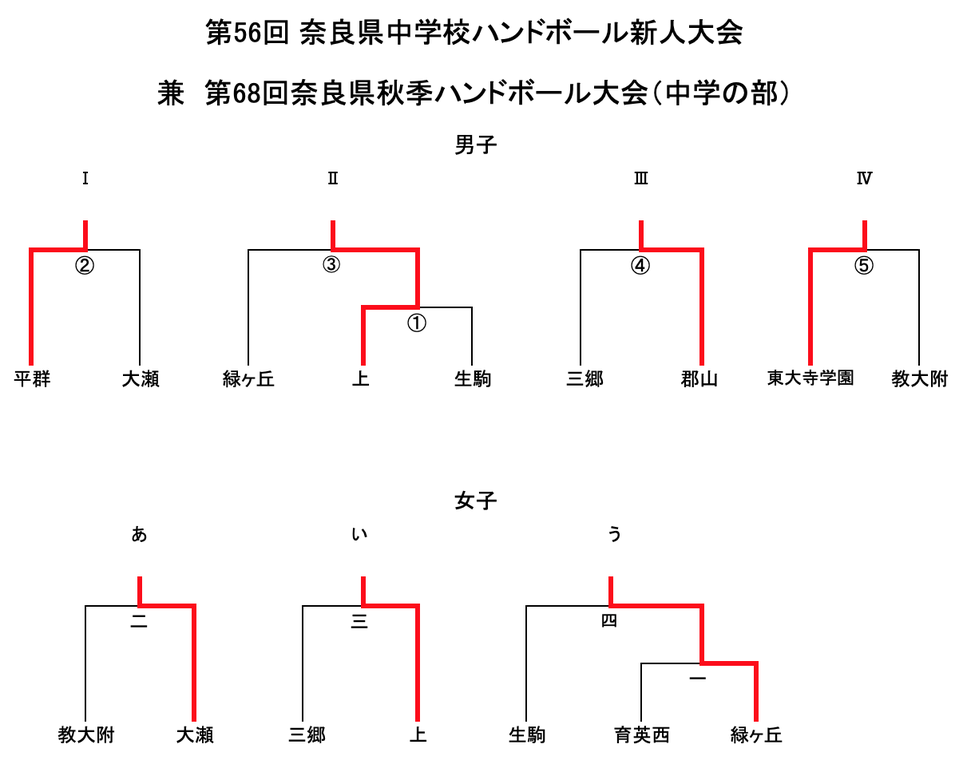 2019年11月04日 第56回奈良県中学校ハンドボール新人大会最終日結果(11月4日) <男子>優勝:東大寺学園 2位:上中学校 3位:平群中学校 4位:郡山中学校<女子>優勝:緑ヶ丘中学校 2位:上中学校 3位:大瀬中学校無事に3日間の日程を終えることができました。大会運営にご協力ありがとうごさいました。また各校への温かいご声援、ありがとうございました。