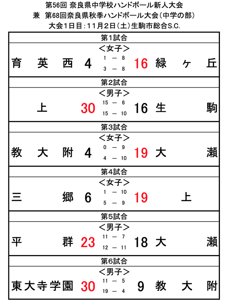 2019年11月04日 第56回奈良県中学校ハンドボール新人大会最終日結果(11月4日) <男子>優勝:東大寺学園 2位:上中学校 3位:平群中学校 4位:郡山中学校<女子>優勝:緑ヶ丘中学校 2位:上中学校 3位:大瀬中学校無事に3日間の日程を終えることができました。大会運営にご協力ありがとうごさいました。また各校への温かいご声援、ありがとうございました。