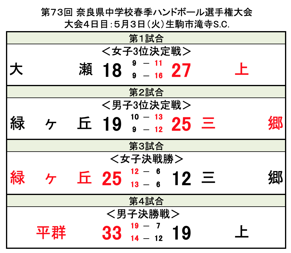 2022年05月03日 第73回 奈良県中学校春季ハンドボール選手権大会4日目結果 男女の決勝戦はKCNで放送される予定です。詳しくは、以下のHPでご確認ください。https://www.kcn.jp/kcnfamily/areawide.html